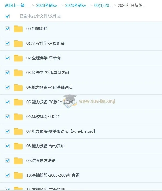 2026年考研启航英语全程班【田静马天艺等】。 13.强化阶段-2010-2017年真题 11.能力预备-定向特训 10.基础阶段-2005-2009年真题 09.讲真题方法论 08.能力预备-句句真研 07.能力预备-零基础语法 06.择校择专业指导 05.能力预备-26版单词之间 04.能力预备-考研基础词汇 03.抢先学-25版单词之间 02.全程伴学-早带背 01.全程伴学-月度班会 2024年考研启航英语全程班【田静马天艺等】 ├── 新群组号:970062162.txt ├── 资源失效或代找,联系leobba_cn.txt ├── 【网课更新地址】小熊猫免费网课资料2群.png...