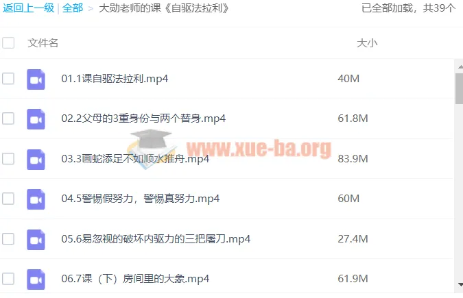 自驱法拉利致家长的必修课。 这门课程旨在帮助家长培养孩子的自我驱动力,引导他们像法拉利一样高效运转。通过教授激励方法、目标设定和自我管理技巧,家长将学会如何培养孩子的内在动力,帮助他们在学业和生活中取得成功。 ├── 01.1课自驱法拉利.mp4 ├── 02.2父母的3重身份与两个替身.mp4 ├── 03.3画蛇添足不如顺水推舟.mp4 ├── 04.5警惕假努力,警惕真努力.mp4 ├── 05.6易忽视的破坏内驱力的三把屠刀.mp4 ├── 06.7课(下)房间里的大象.mp4 ├── 07.9学霸学渣宁有种乎.mp4 ├── 08.10课成长心态尽在掌握.mp4 ├── 09.11课…...