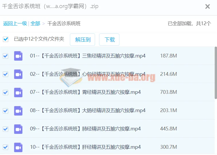 千金舌诊医学系统班学习课程。 本课程旨在教授传统中医千金舌诊技术。 学员将学习舌诊的原理、历史及其在中医诊断中的重要性。课程包括舌相观察、辨舌质、辨舌苔等内容,并结合实践案例进行教学。 通过本课程,学员将掌握舌诊技术并能在临床实践中应用。 ├── 01--【千金舌诊系统班】三焦经精讲及五腧穴按摩.mp4 ├── 02--【千金舌诊系统班】心包经精讲及五腧穴按摩.mp4 ├── 07--【千金舌诊系统班】胃经精讲及五腧穴按摩.mp4 ├── 08--【千金舌诊系统班】大肠经精讲及五腧穴按摩.mp4 ├── 09--【千金舌诊系统班】肺经精讲及五腧穴按摩.mp4 ├── 10--【千金舌诊系统班】…...