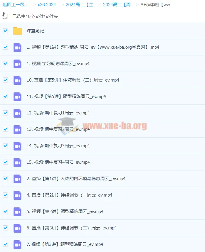 本资料包包含2023-2024学年周云老师高二生物秋季提升班全套学习资源,涵盖神经调节、体液调节、免疫调节等核心知识点。内含17份详细课堂笔记PDF(含重点标注)+38节高清视频课程(含学习规划课、正课直播、题型精讲及期中期末复习)。特别适合想系统提升生物成绩的高二学生,通过名师讲解+题型训练+阶段复习三位一体学习模式,帮助学生掌握必修三《稳态与环境》重难点,冲刺生物高分。所有资料均为电子版,支持手机/平板/电脑随时学习。...