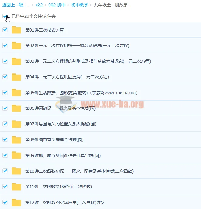 初中数学课外辅导人教版辅导班九年级全一册数学同步基础(预习+巩固)人教版-百度网盘资源下载地址由网盘用户[lan****ke3]分享,包含doc,mp4等格式共计147个文件,文件大小为2.16GB,分享时间2025-07-05,此百度网盘资源由来客盘网盘搜索引擎收集整理。...