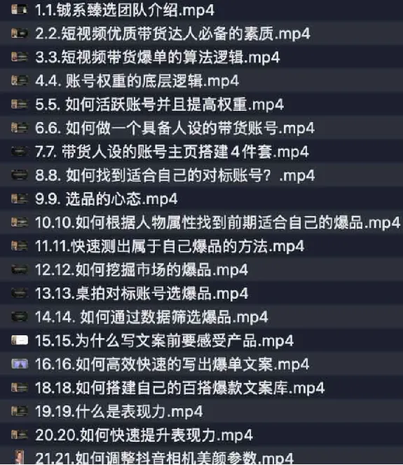 0基础小白极速入门全领域带货课。 专为带货小白定制的全场景实战课! 从抖音、快手到视频号、小红书,拆解多平台带货底层逻辑,手把手教你选品组货、爆款内容制作与直播间搭建。 搭配 AI 工具高效生成脚本、优化投放,掌握私域引流与跨平台变现技巧,7 天打通 “选品 - 内容 - 转化” 全链路,零基础也能快速开启带货副业! ├── 1.1.铖系臻选团队介绍.mp4 ├── 2.2.短视频优质带货达人必备的素质.mp4 ├── 3.3.短视频带货爆单的算法逻辑.mp4 ├── 4.4. 账号权重的底层逻辑.mp4 ├── 5.5. 如何活跃账号并且提高权重.mp4 ├── 6.6. 如何做一个具备人设…...