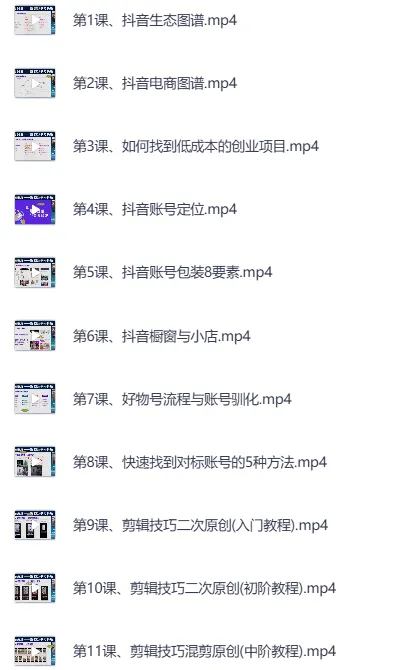 抖音好物带货实操课。 你是否做抖音找不到方向?你是否相信不出镜也能做抖音?你是否想拥有持续稳定的副业收入?你是否觉得做抖音一定要专业的团队?你是否也想做抖音但不知道怎么入手?好物带货实操课,带你全盘实操拆解!完整的好物号流程拆解,全套的视频制作剪辑方法,掌握爆款选品方法与技巧,学会如何写爆款脚本文案。 ├── 第1课、抖音生态图谱.mp4 ├── 第2课、抖音电商图谱.mp4 ├── 第3课、如何找到低成本的创业项目.mp4 ├── 第4课、抖音账号定位.mp4 ├── 第5课、抖音账号包装8要素.mp4 ├── 第6课、抖音橱窗与小店.mp4 ├── 第7课、好物号流程与账号驯化.mp4 ├…...