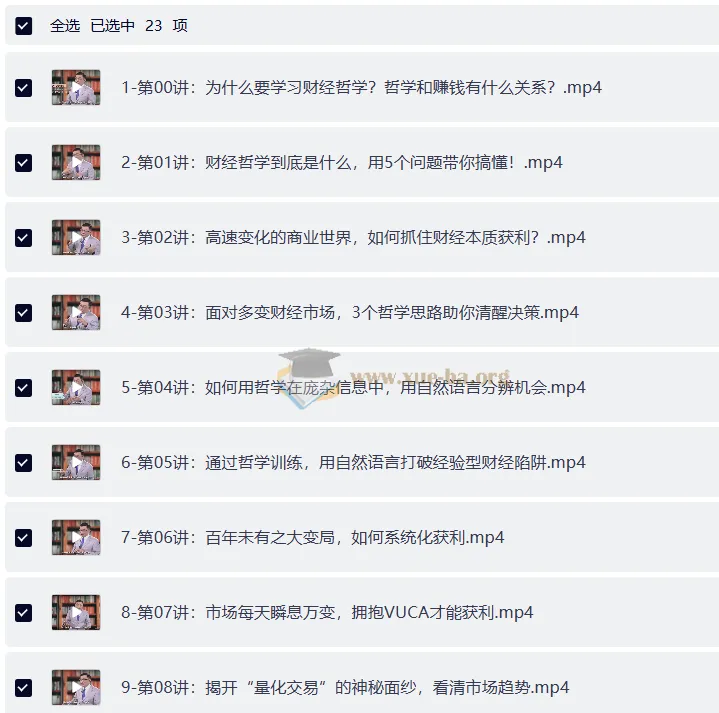 台湾大学苑举正教授的财经哲学课。 用哲学的视角带你洞悉财富真相,看懂获利的本质。 ├── 1-第00讲:为什么要学习财经哲学?哲学和赚钱有什么关系?.mp4 ├── 2-第01讲:财经哲学到底是什么,用5个问题带你搞懂!.mp4 ├── 3-第02讲:高速变化的商业世界,如何抓住财经本质获利?.mp4 ├── 4-第03讲:面对多变财经市场,3个哲学思路助你清醒决策.mp4 ├── 5-第04讲:如何用哲学在庞杂信息中,用自然语言分辨机会.mp4 ├── 6-第05讲:通过哲学训练,用自然语言打破经验型财经陷阱.mp4 ├── 7-第06讲:百年未有之大变局,如何系统化获利.mp4 ├── 8…...