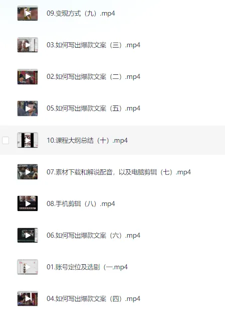 蝶欣影视解说培训班,新手0基础入门做影视解说,资源下载。 课程大纲 01.账号定位及选剧(一.mp4 02.如何写出爆款文案(二).mp4 03.如何写出爆款文案(三).mp4 04.如何写出爆款文案(四).mp4 05.如何写出爆款文案(五).mp4 06.如何写出爆款文案(六).mp4 07.素材下载和解说配音,以及电脑剪辑(七).mp4 08.手机剪辑(八).mp4...