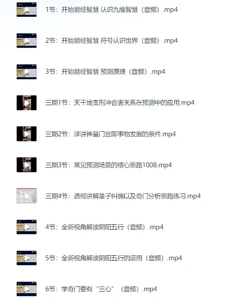 参透易经奇门玄学预测22门技术的逻辑并学会应用,课程。课程通过丰富的视频讲解与详实的PDF笔记,系统阐释易经奇门玄学中22门核心预测技术及其应用。内容涵盖奇门通甲核心预测与找用神思路、数字号码预测、易经智慧理念、阴阳五行解读及天干地支、八门八神理论。同时提供典型预测场景的实操案例,包括婚姻预测、终生局分析、环境风水布局和个人运势解析。课程内容兼顾基础入门与中高级干货,融入量子纠缠等新视角,对商业机会预判和风险防范提供参考,为从易经新手到资深预测者搭建了全面提升预测与决策能力的知识体系。 ├── 1节:开始易经智慧 认识九维智慧(音频).mp4 ├── 2节:开始易经智慧 符号认识世界(音频).…...
