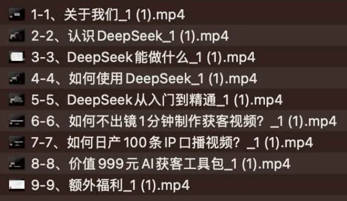 DeepSeek获客训练营-ai电商教程,课程。DeepSeek精心打造的获客训练营,为电商从业者提供前沿AI实战教程。课程从品牌基础认知展开,逐步揭示AI工具DeepSeek的核心功能与操作技巧。您将系统学习如何零基础掌握智能获客技术,重点包含两大创新技能:无需真人出镜的1分钟快速视频制作技法,以及单日量产百条IP口播视频的高效策略。 训练营特别准备价值999元的AI获客工具包,涵盖实用模板与资源库。课程尾声另有专属福利解锁,帮助电商运营者实现从流量获取到转化提升的全链路优化。 ├── 1-1、关于我们_1 (1).mp4 ├── 2-2、认识DeepSeek_1 (1).mp4 ├── 3…...