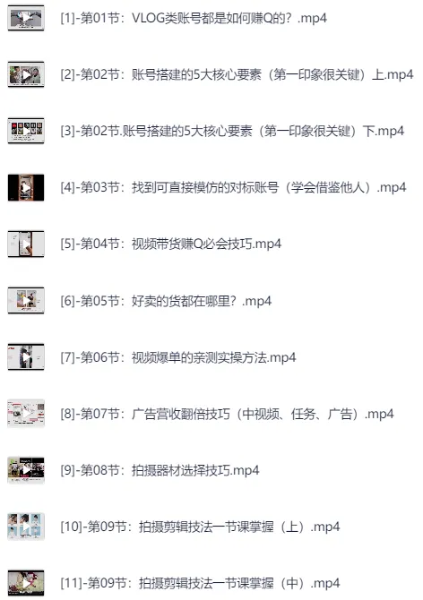 小白VLOG短视频训练营课程。 本课程专为初学者设计,帮助您快速掌握VLOG制作技巧。学习拍摄、剪辑、内容创作等关键要素,提升您的短视频制作能力。通过实践训练,打造吸引人、精彩生动的VLOG作品,展现自我魅力。 ├── [1]-第01节:VLOG类账号都是如何赚Q的?.mp4 ├── [2]-第02节:账号搭建的5大核心要素(第一印象很关键)上.mp4 ├── [3]-第02节.账号搭建的5大核心要素(第一印象很关键)下.mp4 ├── [4]-第03节:找到可直接模仿的对标账号(学会借鉴他人).mp4 ├── [5]-第04节:视频带货赚Q必会技巧.mp4 ├── [6]-第05节:好卖的货…...