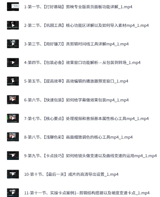 介绍 剪映电脑版进阶拔高案例实操。 《剪映电脑版进阶拔高案例实操》课程专为有一定基础的剪辑师设计,帮助学员在剪映电脑版上提升剪辑水平。课程通过真实案例解析,教授高级剪辑技巧、特效运用和音视频同步等实战内容,助力学员打造更加专业、高质量的剪辑作品,提升创作能力和市场竞争力。 ├── 1-第一节、【打好基础】剪映专业版首页面板功能详解_1.mp4 ├── 2-第二节、【巩固工具】核心功能区详解以及如何导入素材mp4_1.mp4 ├── 3-第三节、【用好镰刀】真剪辑时间线工具详解mp4_1.mp4 ├── 4-第四节、【包装必备】效果窗口功能解析---从包装到转场_1.mp4 ├── 5-第五节、…...