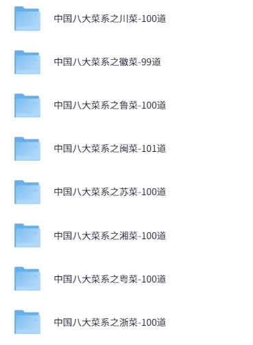 中国八大菜系: 川菜、湘菜、粤菜、闽菜、苏菜、浙菜、徽菜和鲁菜。 中华美食博大精深,因着地理、气候、习俗、特产的不同,因而发展出各式各样具有地方风味和特色的菜肴,以及相应的烹调方法,形成了不同地方风味的菜系,当中最着名的有川菜、湘菜、粤菜、闽菜、苏菜、浙菜、徽菜和鲁菜八种,合称八大菜系。
