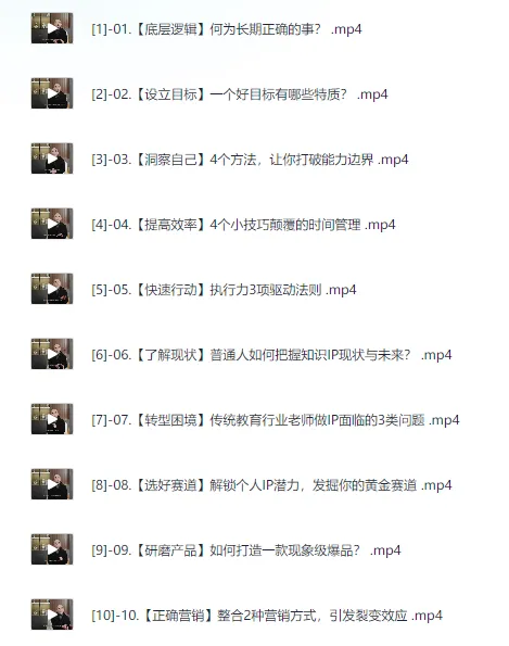 知识IP创业实操课,从0到1快速孵化让你的个人品牌价值百万。 知识IP创业实操课,从0到1快速孵化让你的个人品牌价值百万,课程。 本课程系统讲解如何从零开始快速孵化个人品牌,实现知识IP的商业转化。课程围绕底层逻辑与长期正确行为展开,探讨好目标设定、能力边界突破和时间管理的技巧,强调执行力与快速行动的重要性。讲解知识IP现状与未来走势,解析传统教育转型困境和黄金赛道选择,指导打造现象级产品与营销策略,助力将流量转化为持久客户。内容还涵盖从私域变现到借势营销、商业模式构建、合伙人选择以及创业团队打造。课程从避坑指南到团队危机应对,提供价值观建设和落地赋能的实战经验,辅以关于ChatGPT与知识付…...