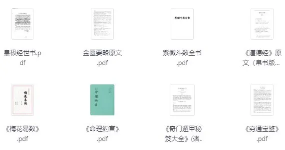 对玄学感兴趣必看的26本书。 具体的自己看目录,都是老祖宗留下的智慧,各种玄学大集合,感兴趣的建议转存到自己的网盘~ ├── 皇极经世书.pdf ├── 金匮要略原文.pdf ├── 紫微斗数全书.pdf ├── 《道德经》原文(帛书版).pdf ├── 《大六壬銀河棹正附集》.pdf ├── 《滴天髓》.pdf ├── 《绘图地理五诀》.pdf ├── 《火珠林》.pdf ├── 《六壬神课》.pdf ├── 《梅花易数》.pdf ├── 《命理約言》.pdf ├── 《奇门遁甲秘笈大全》(诸葛武候) .pdf ├── 《穷通宝鉴》.pdf ├── 《七政四余》.pdf ├── 《神峰通考》…...
