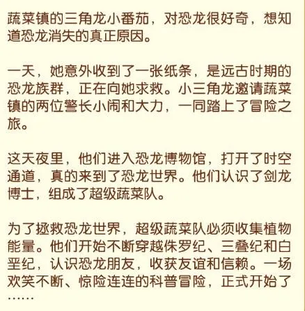 蔬菜警长最新恐龙侦探故事!恐龙大冒险全新故事来啦! ※ 主打恐龙探秘冒险,极大满足孩子对于远古恐龙生物好奇的儿童故事专辑! ※ 认识150+独特的恐龙好友,200+神奇的远古植物,一次难忘的生命故事! ※ 穿越三叠纪、侏罗纪和白垩纪,见识神奇的自然地理风貌,一段独特的冒险体验! ...